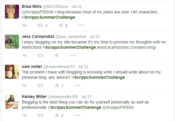 Week 4 of our #ScrippsSummerChallenge has come and gone, but we have all the highlights right here! Last week’s challenge was to create a personal blog and write a kick-off post. Members that already had a blog were asked to either write a new post about the benefits of blogging or share their blogging tips, tricks and/or questions, once again using the hashtag #ScrippsSummerChallenge .